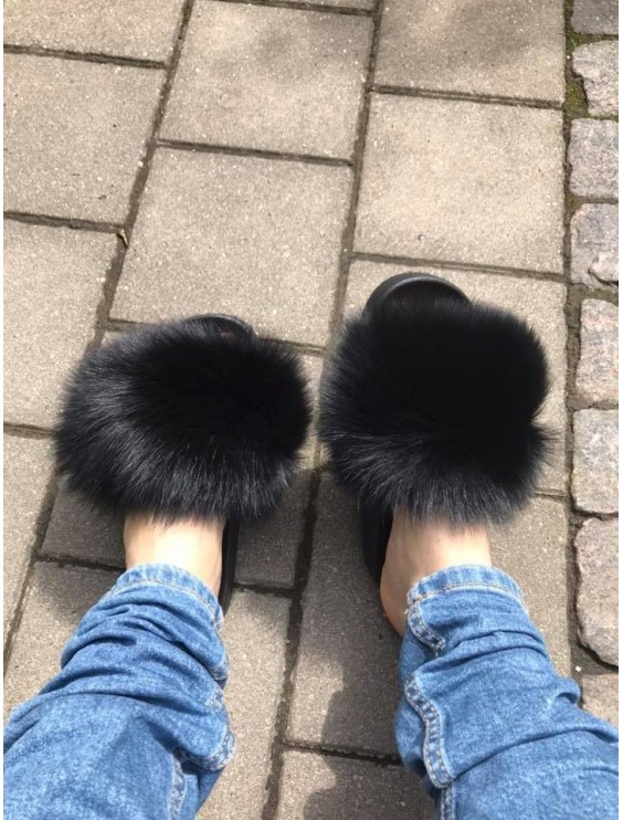 Furry slide sandals fox fur black/grey. Ursnygga exklusiva bekväma sandaler / tofflor som är perfekta för både inomhus samt utomhusbruk. Sandalerna har mjuk och fluffig rävpäls dekorerat framtill som ger ett riktigt lyxigt intryck. Sulan är i gummi och är mjuk och bekväm att gå i. Normala i storleken.100% rävpäls. Sula i gummi