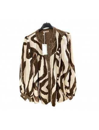 - Design: Blusen har ett abstrakt zebratryck i brunt och beige, en ståkrage med knäppning, och mjukt rynkade detaljer vid halsringningen och muddarna. Den har långa ärmar med knäppta manschetter och en avslappnad passform. Spets detaljer på ryggen och runt om halsen