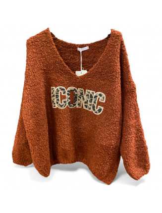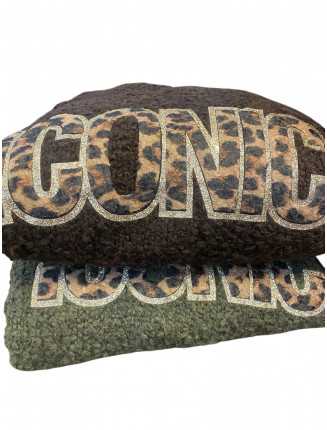 texturerad V-ringad tröja med ordet "ICONIC" i leopardmönster på framsidan.I