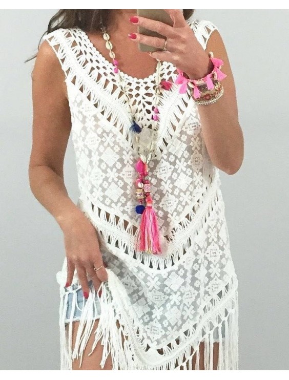 Luftig strandklänning i snyggt virkat materialLuftig stickad klänning för stranden.